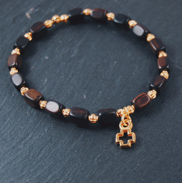 Armband med 6 mm fyrkantiga träpärlor brunsvart omväxlande med guldfärgade pärlor, hänge med liksidigt kors i guldfärgad metall