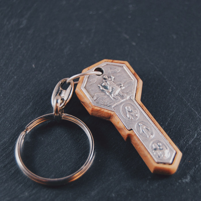 Nyckelring med "Nyckel" i metall med S:t Kristoffer, omfattning av olivträ