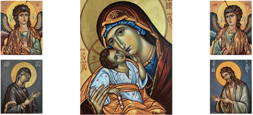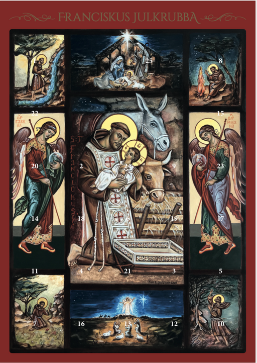 Franciskusbilder på framsidan, ikonmotiv i luckorna. Ikonograf Christina Lundström berättar på baksidan.