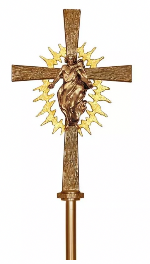 Processionskors i brons med Krisus som påskens Segerfurste. Korset mäter ca 37 x 24 cm. Inklusive stång ø 28 mm