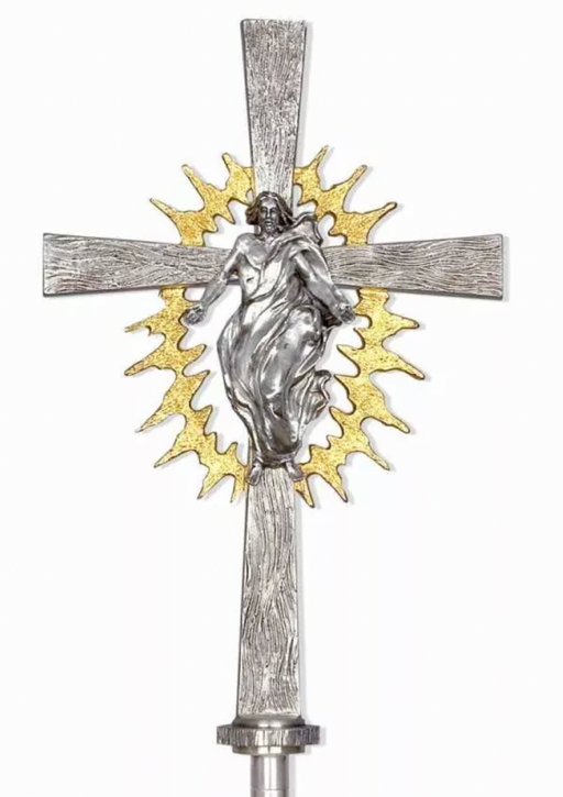 Processionskors i försilvrad brons med Krisus som påskens Segerfurste. Korset mäter ca 37 x 24 cm. Inklusive stång ø 28 mm