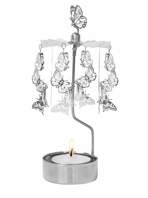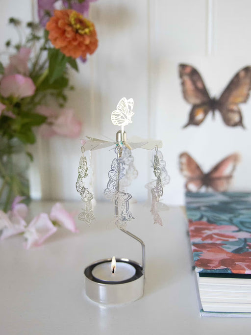 Änglaspel i silvermetall som snurrar av värmen från ljuset. Fjärilar passar alltid!