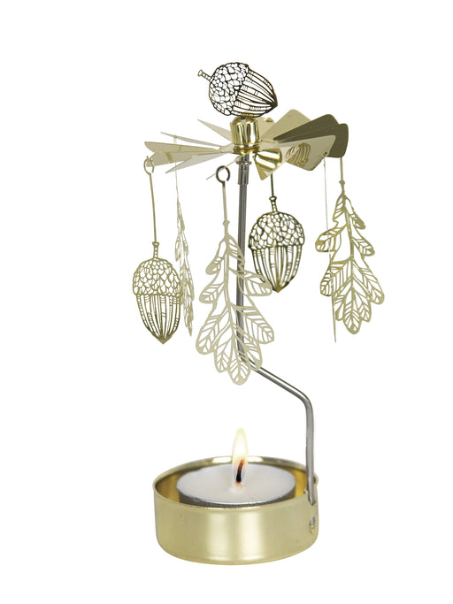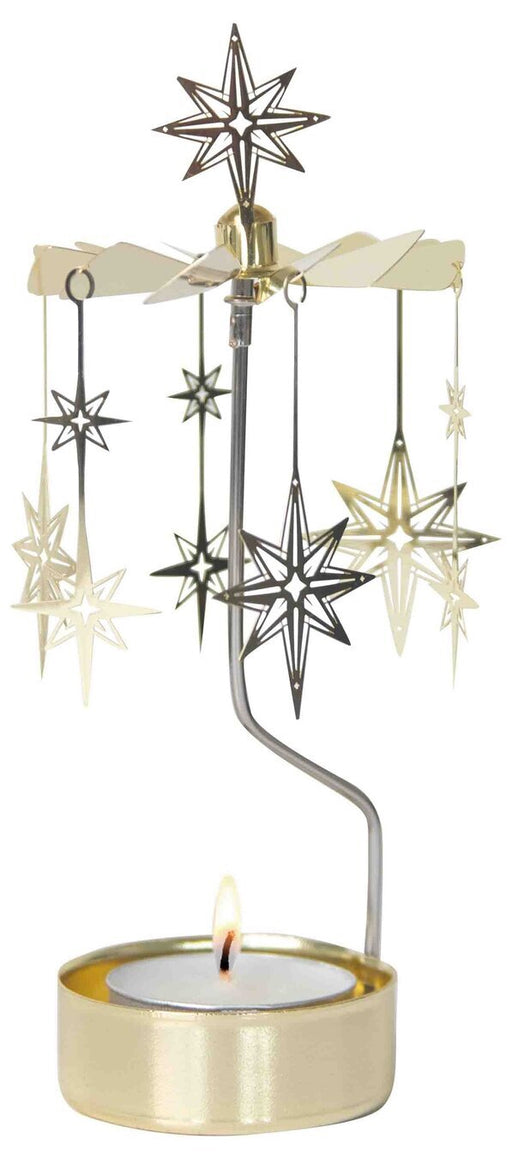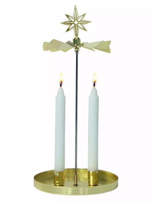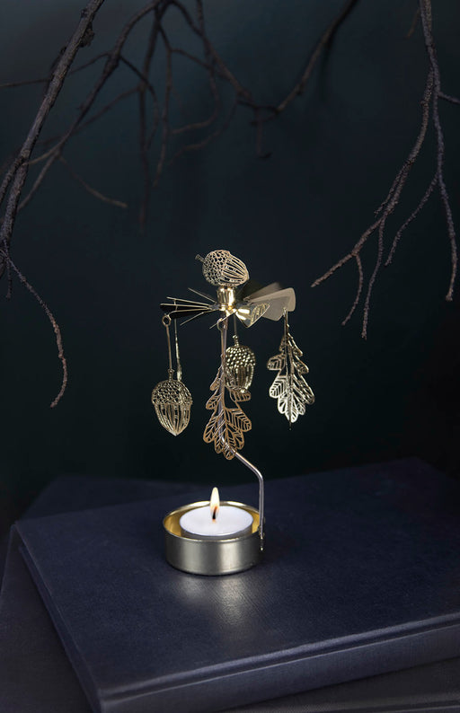 Änglaspel i guldmetall. Snurrar av värmen från ljuset, ett värmeljus medföljer i förpackningen. Mått: 16 cm hög