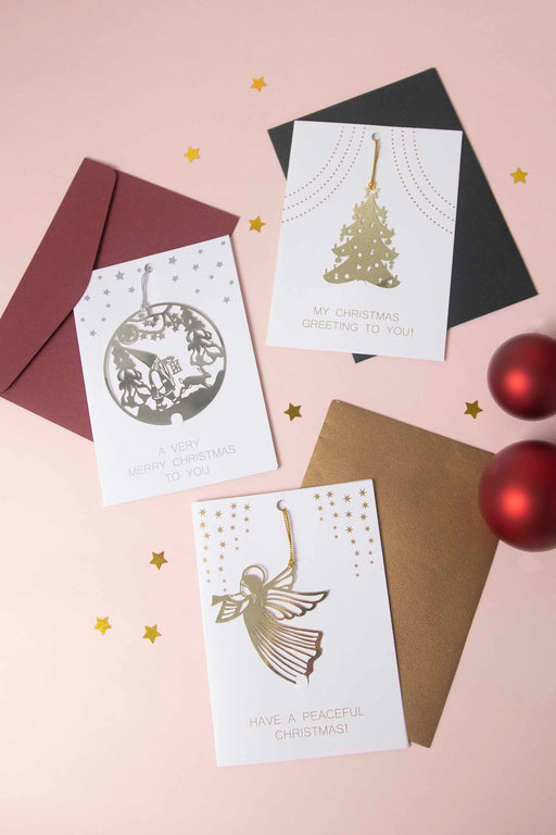 Julkort med guldmetallhänge och tillhörande kuvert.A6