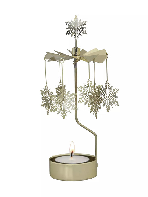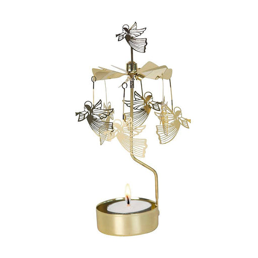 Änglaspel i guldmetall. Snurrar av värmen från ljuset, ett värmeljus medföljer i förpackningen. Mått: 16 cm hög
