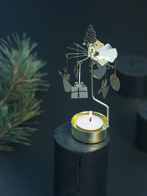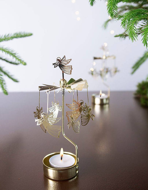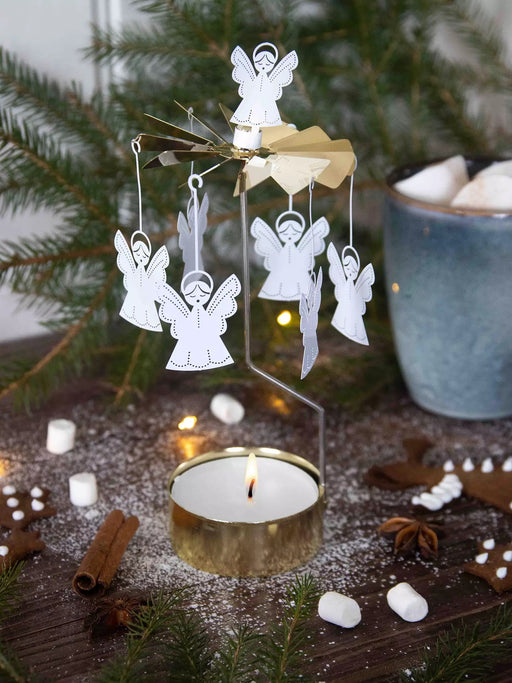 Änglaspel med plats för värmeljus, änglaspelet som roterar när värmen stiger blir en fin detalj året runt. Höjd: 16cm