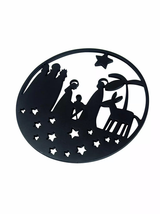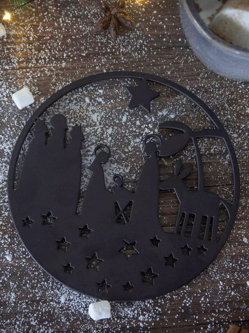 Slitstarkt grytunderlägg i svart metall med matt finish. Fint krubba-motiv som passar perfekt på julbordet. 14.5 cm i diameter.