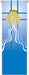 Hänges på vägg, stång eller predikstol. I raytex (konstfiber). Storlek 300 x 100 cm. Avslutas i toppen med en öppen kanal med trä stång med ändrundlar och lina för upphängning. I nederkantens söm ligger en metalltyngd.