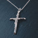 Krucifix på runda korsarmar, snett avkapade med Kristusfigur. Längd 43 mm. Pansarcollie 50 cm. Allt i sterling silver.