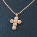 Förgyllt silverkors med fem Swarovskipärlor med omfattning i guld, som kan ses som en påminnelse om Jesu fem sår. 40 cm kedja. En förlängning/extensionpå 7 cm kan bifogas om så önskas.