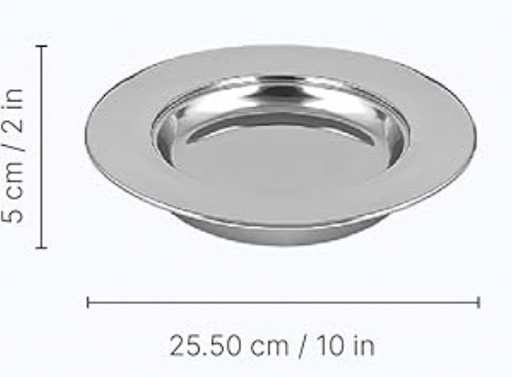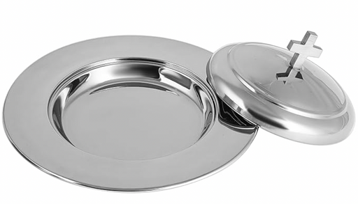 Ett rostfritt fat för nattvardsbröd i silverskimrande rostfritt stål. 5 cm djup, 25,5 cm diameter. Finns även täckade lock (köpes separat).