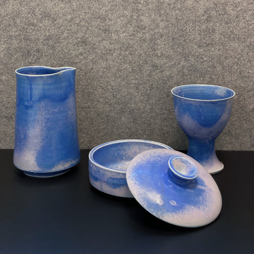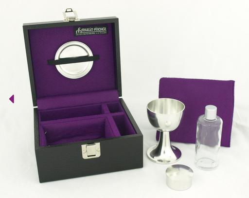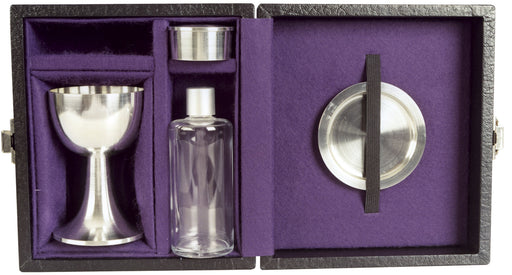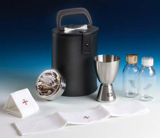 Rostfri kalk 12 cm hög (rymmer 2 dl), försilvrad oblatask 8,5 cm diameter (rymmer ca 75 oblater), glasflaskor, torkduk och corporale.