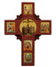 Ikonkors E406 37 x 27 cm med central korsfästelseikon, krönt med »metamorfosis» (förklaringen), t.v. intåget, t.h. uppståndelsen, under centrum pingstikonen och längst ned Gudsmoderns insomnande.