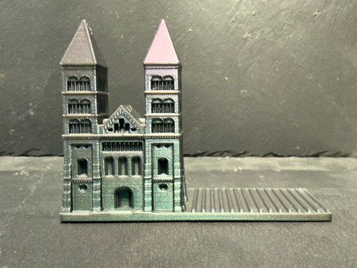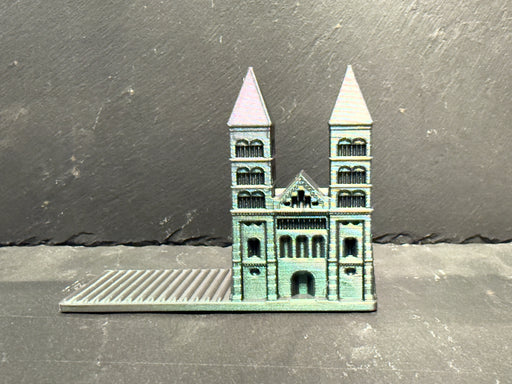 Bokstöd i form av lunds Domkyrka, tillverkad i Lund i återvunnen plast. Design Ola von Koskull.