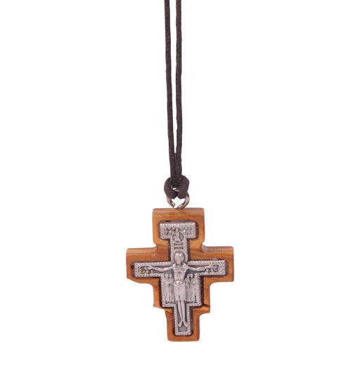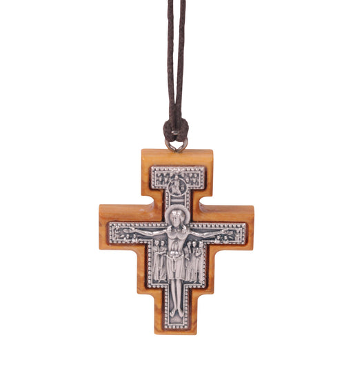 Nyckelring med San Damiano-kors i metall med omfattning av olivträ