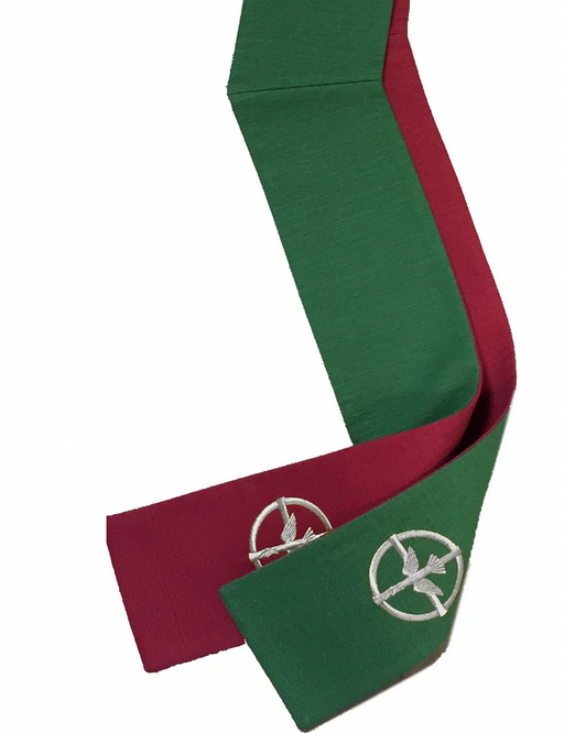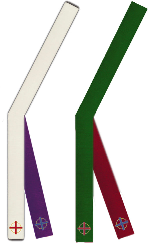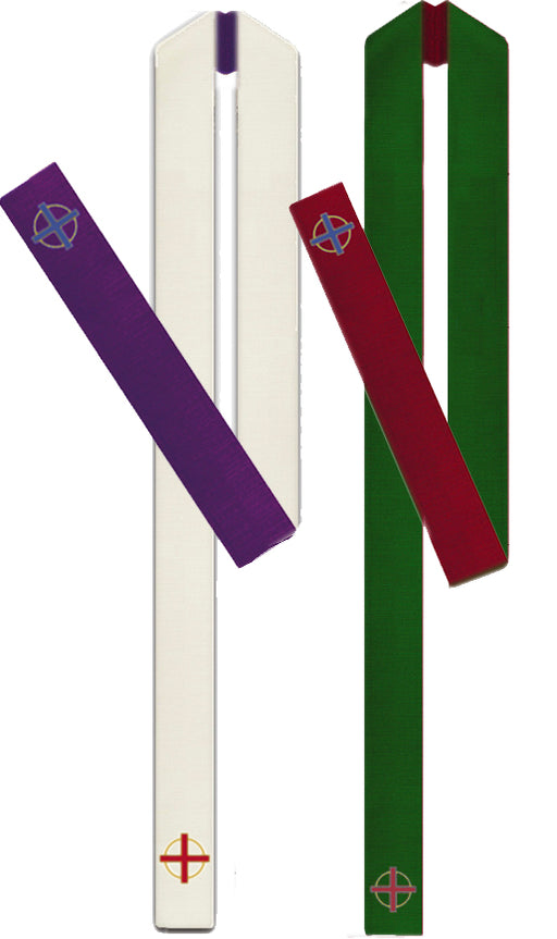 Vändbar diakonstola dekorerad med diakonemblem i nederkant.