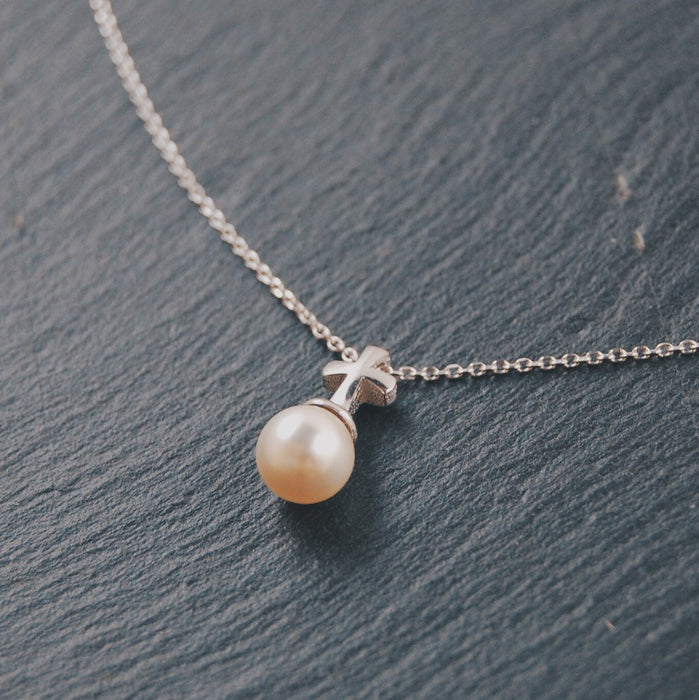 Silverhalsband med kors som kröner silverklot/pärla. Kedja i silver 40 cm. En förlängning/extensionpå 7 cm kan bifogas om så önskas.